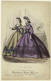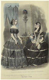 В 1850-х годах, женские юбки были выпукло и колокольчатые, поддержанный кринолин petticoats.They часто признакам глубоких оборками или tiers.Long шаровары и панталоны с кружевами были popular.Tiered накидка-куртки были в моде, как и Пейсли узорной shawls.Deep капоты носили и волосы были втянут в булочках или боковые катушки из центра расставания.