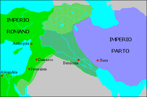 На этой карте показаны границы Римской империи около 115 года, когда вспыхнуло восстание диаспоры. Конфликтующие провинции с его еврейским населением отмечены на карте вместе с важными городами области. Чистые зеленые зоны соответствуют провинциям Петарея, Месопотамия, Ассирия и Армения (все с важным еврейским населением), которые были присоединены к Риму после разгрома парфян, а также новые территории для провинций Иудеи и Сирии. b>