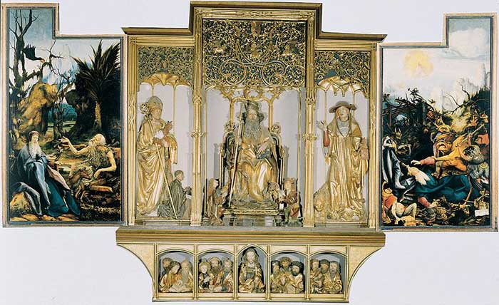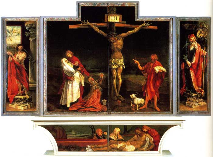 Алтарь Изенхайма - самая известная работа Грюневальда. Он был написан для монахов монастыря Святого Антония в Изенхайме под Кольмаром. Его сложный структура может быть открыта, чтобы показать три разные сцены.