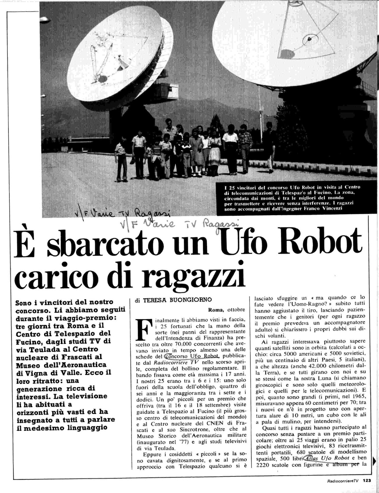 Обновление b> & nbsp; (17/12/2017): Мнение, аналогичное выраженному и поддержанному в этой статье, было также сформулировано Тереза Буонджорно b> & nbsp; (автор, в апреле 1978 года, важного досье на японскую анимацию ) на страницах еженедельного журнала TV Radiocorriere b> i>, в конце своей статьи " Is & nbsp; Робот НЛО, загруженный мальчиками i> "(см. № 42, опубликованный в октябре 1978 года), посвященный группе победителей" Конкурса роботов НЛО ", организованного журналом по случаю выхода в эфир первого цикла эпизодов Goldrake I> в апреле 1978 года. Мальчики, приехавшие из разных частей Италии, получили возможность посетить Телекоммуникационный центр Телеспасио-дель-Фучино Ядерный центр CNEN ( Национальный комитет по ядерной энергии , затем стал ENEA ) Фраскати, Museo Storico dell'Aeronautica Militare из Vigna di Valle (провинция Рима) и, наконец, телевизионные студии Rai на улице Теулада в Риме.