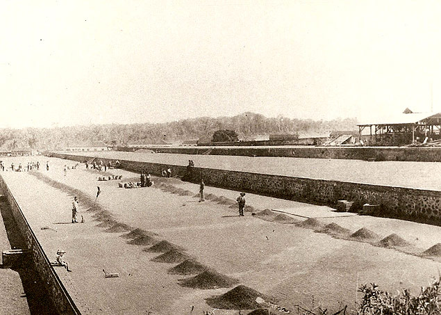 | Café sendo posto para a secagem. Fotografia tirada em 1902, na Fazenda Dumont, São Paulo, Brasil. |
