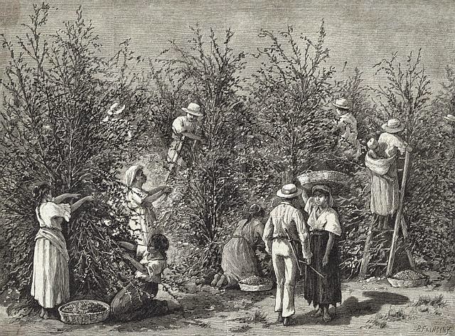 | Gravura retratando escravos indonésios colhendo café, numa fazenda holandesa em Java. |