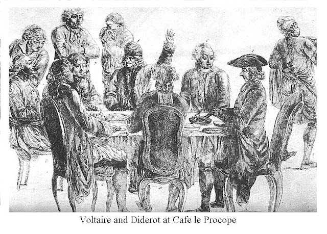 | Гравюра, изображающая философов Вольтера и Дидро, воссоединилась с другими людьми в кофе Le Procope i> в XVIII веке. |