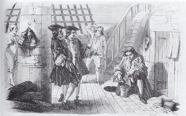 | Gravura retratando o capitão Gabriel Mathieu de Cleau protegendo uma pequena muda de café, a qual estava sendo levada para a ilha de Martinica. |