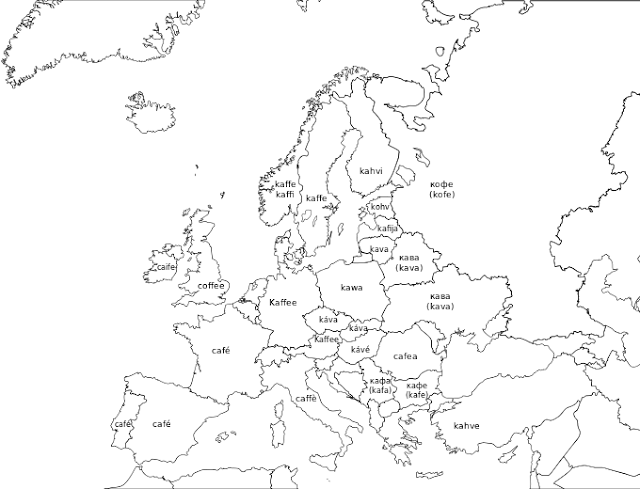 | Mapa mostrando as palavras usadas para se referir ao café em distintos países europeus. |