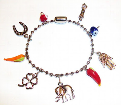 | Cordão com vários amuletos da sorte. |