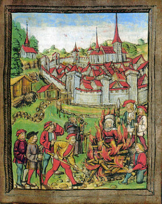 | Gravura medieval retratando a execução de bruxas na fogueira, 1447. |