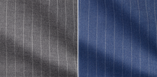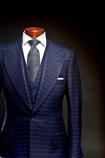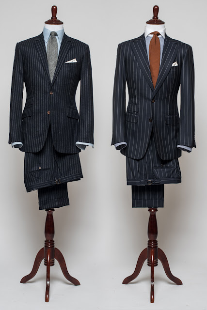 | Granatowy, szary i grafitowy garnitur w jasne prążki to ponadczasowa klasyka. Źródło: tailormadelondon.com |